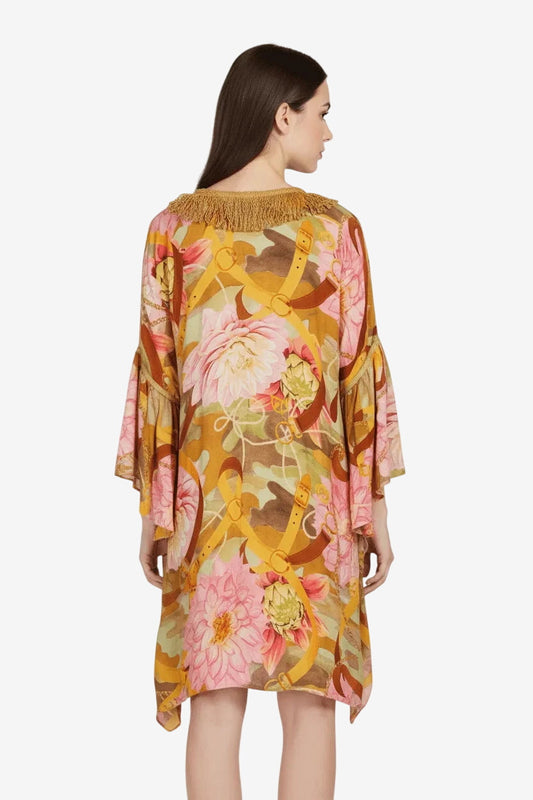 Kaftano Corto Donna Emamò Fantasia Gialla Viscosa Frange Oro — Copricostume Estivo