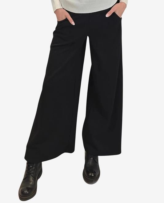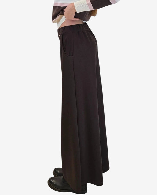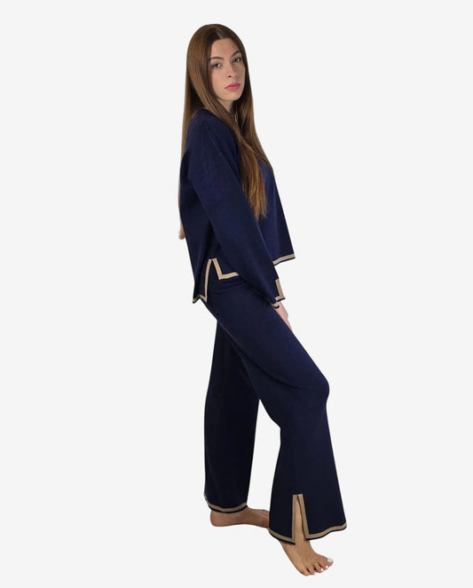 Completo in maglia blu notte con riga camel: comodo, morbido ed elastico