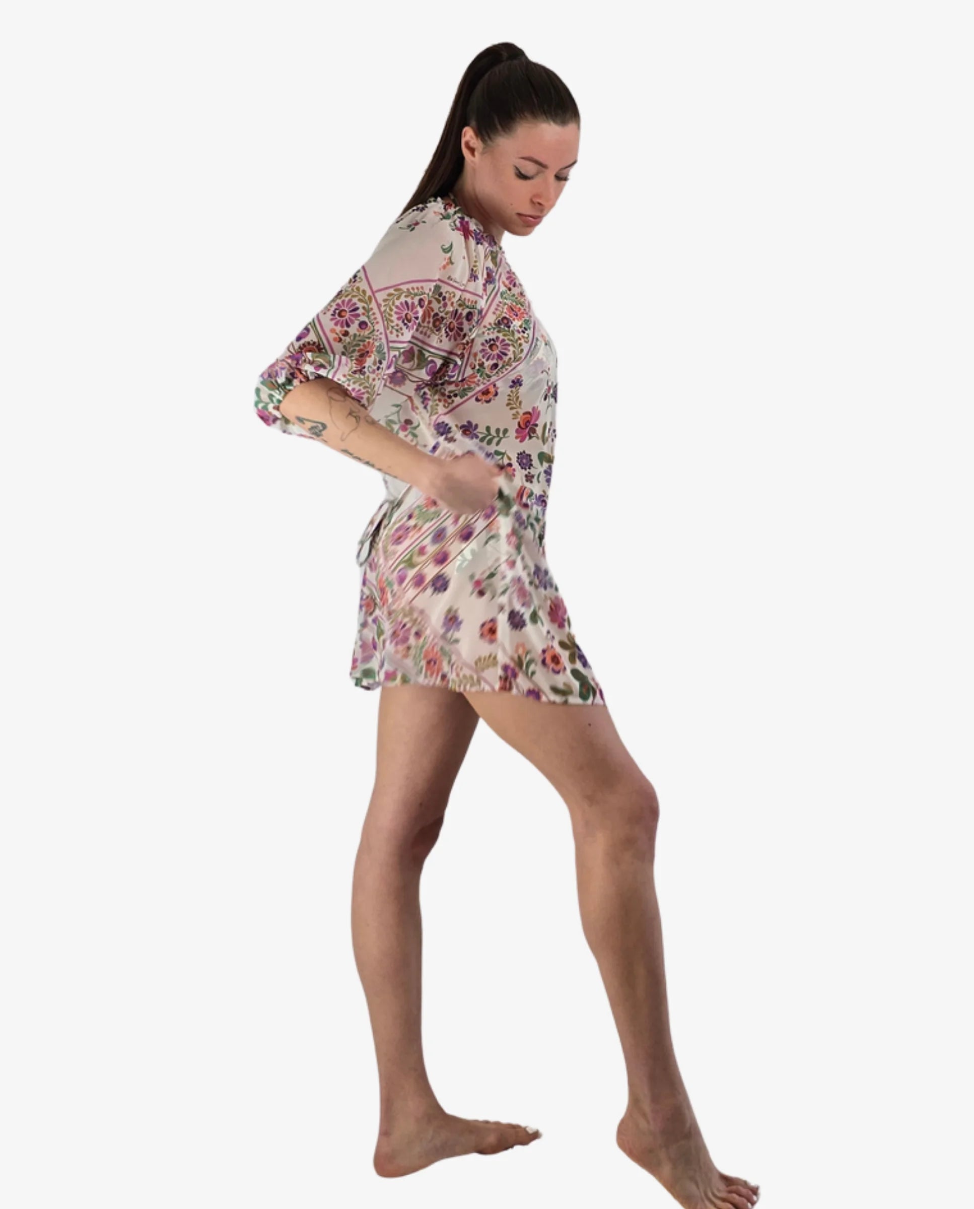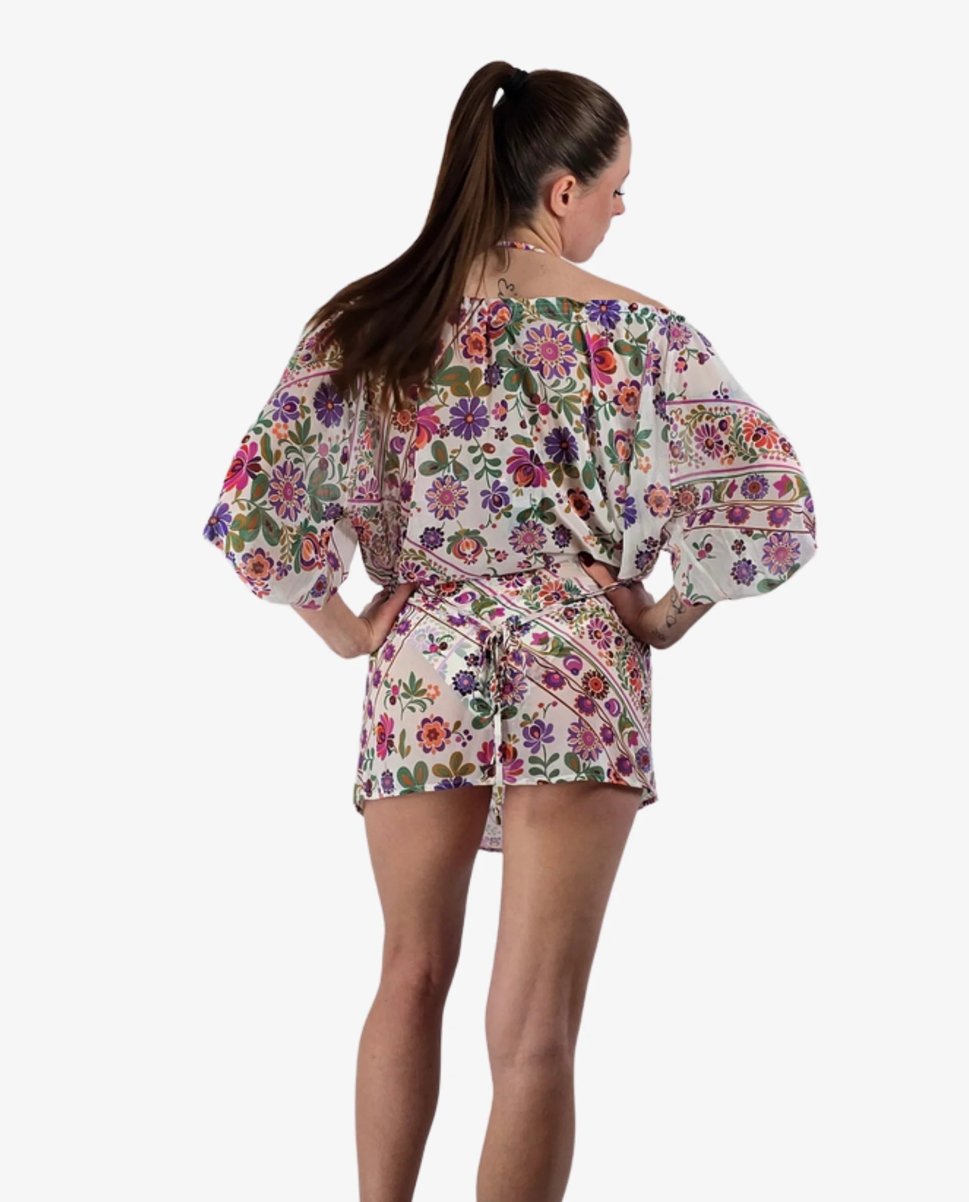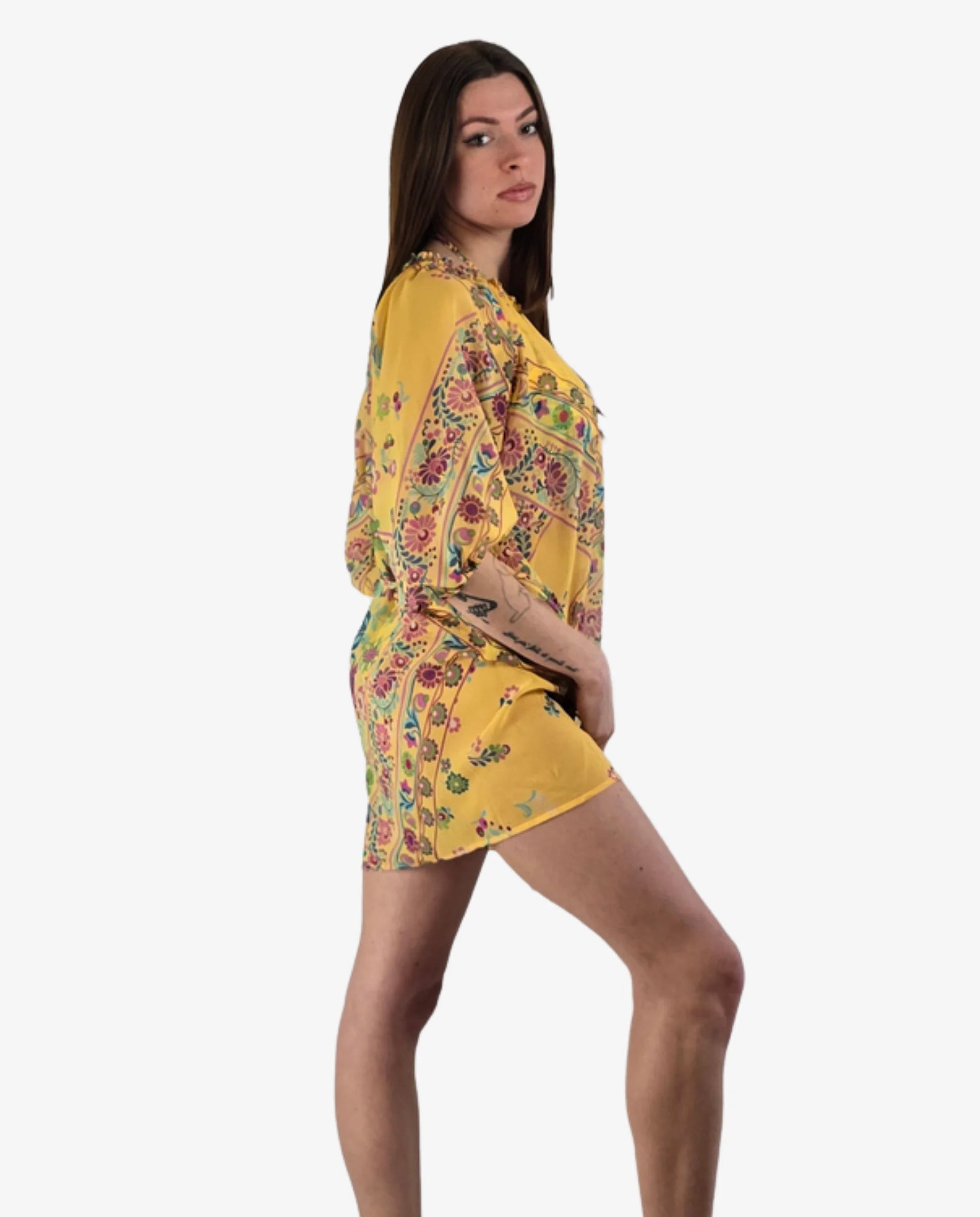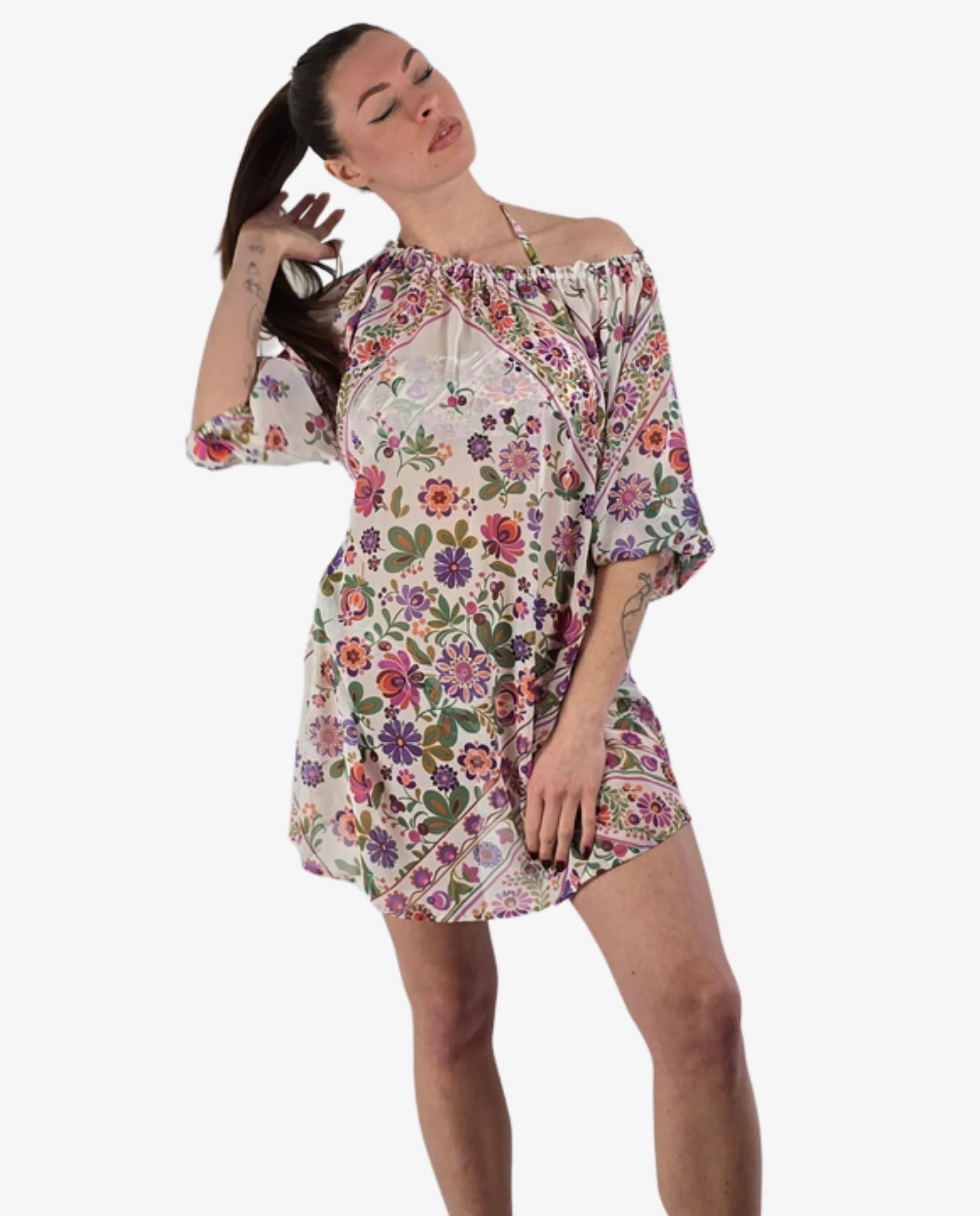 Un abito corto da spiaggia deve essere leggero, non trasparente e resistere ai lavaggi senza perdere la stampa. L’abito corto Miss Bikini in fantasia fiori è disponibile in due varianti distinte: fantasia floreale su fondo bianco oppure su fondo giallo. Entrambe in 100% poliestere — un tessuto che asciuga rapidamente, non si stropiccia e mantiene la stampa vivida nel tempo.