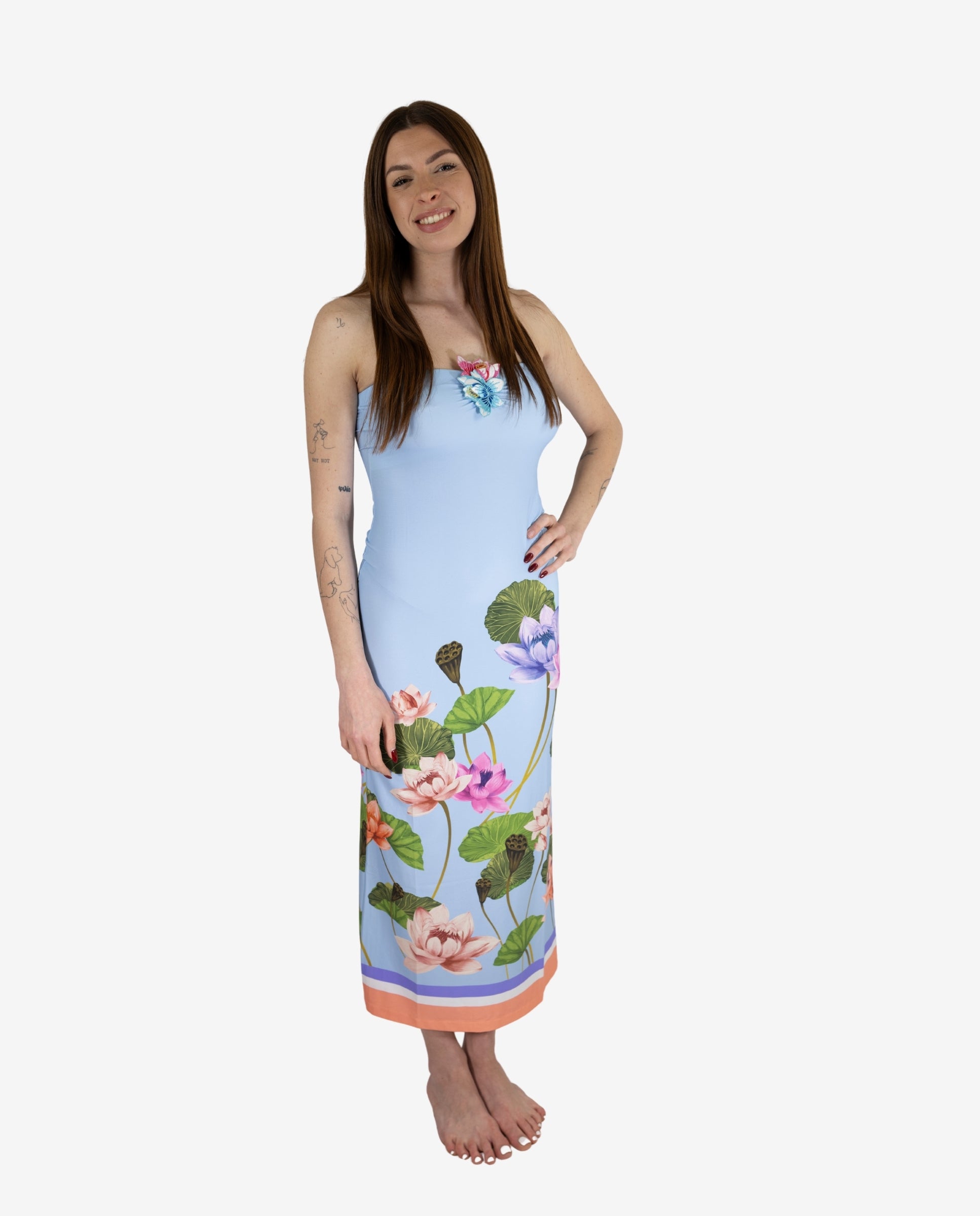 Il Cielo — azzurri, chiari, con quella profondità che cambia con la luce del giorno — su un abito lungo è qualcosa di straordinario. Il tessuto in 86% polyamide è fluido, morbido, con quella caduta che si muove ad ogni passo e cattura la luce in modo diverso ad ogni momento. La silhouette è definita ma libera, elegante ma mai rigida.