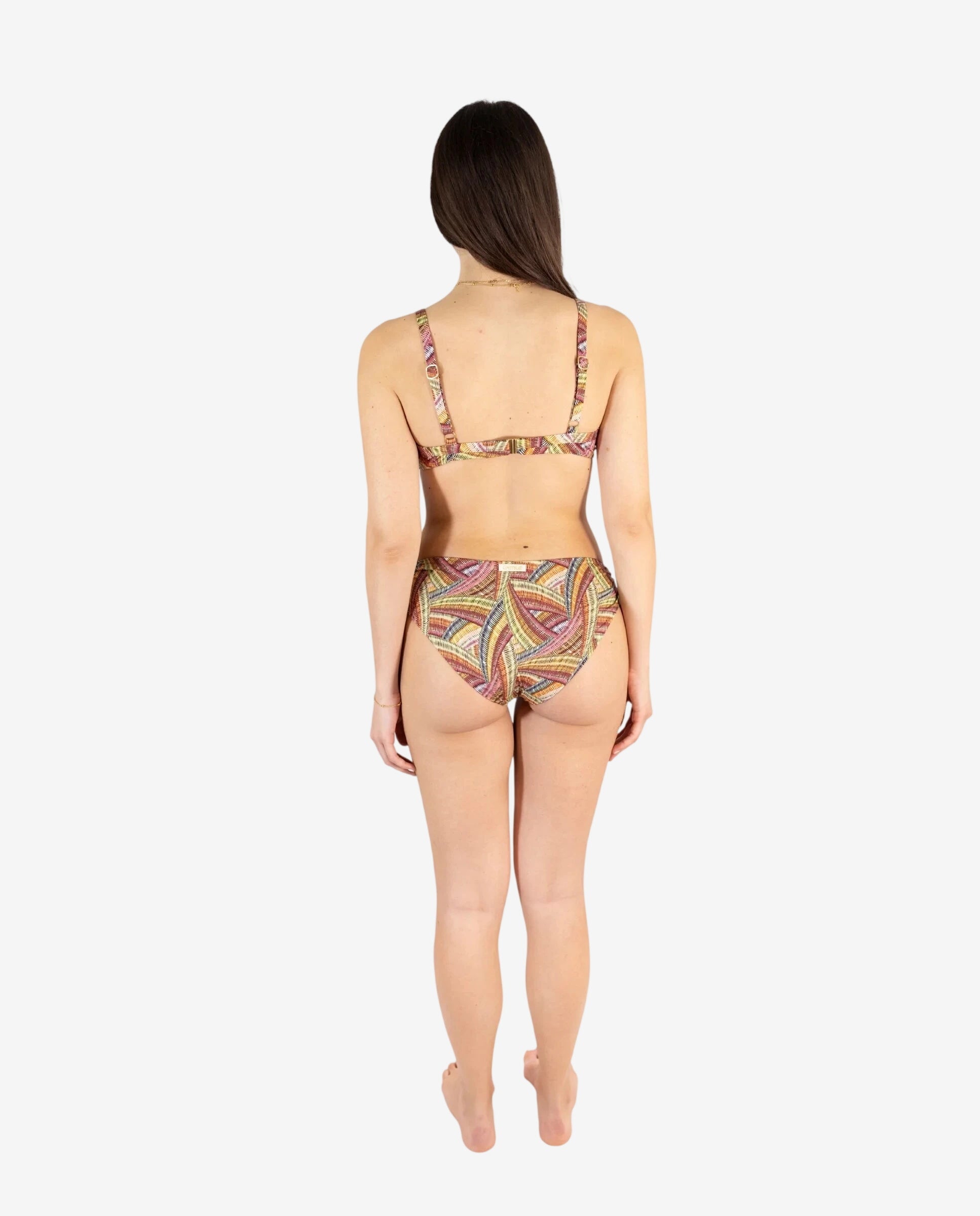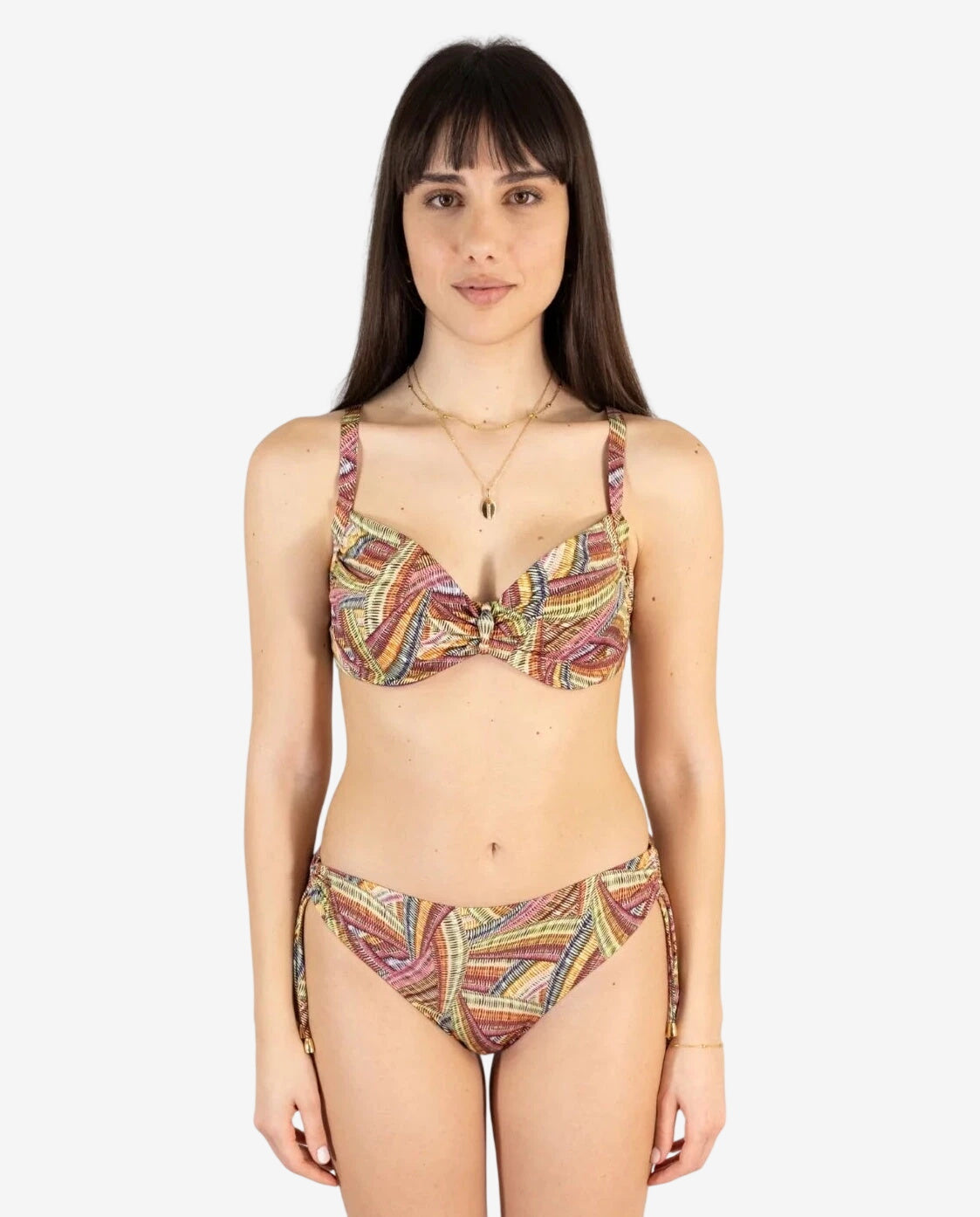 Il ferretto non è un dettaglio — è una dichiarazione. Dice che sai cosa ti valorizza, che non ti accontenti, che la comodità e il desiderio non sono in contraddizione. La coppa abbraccia con quella precisione strutturale che nessun triangolo può dare, e il Multicolor porta tutta l’energia dell’estate direttamente addosso.