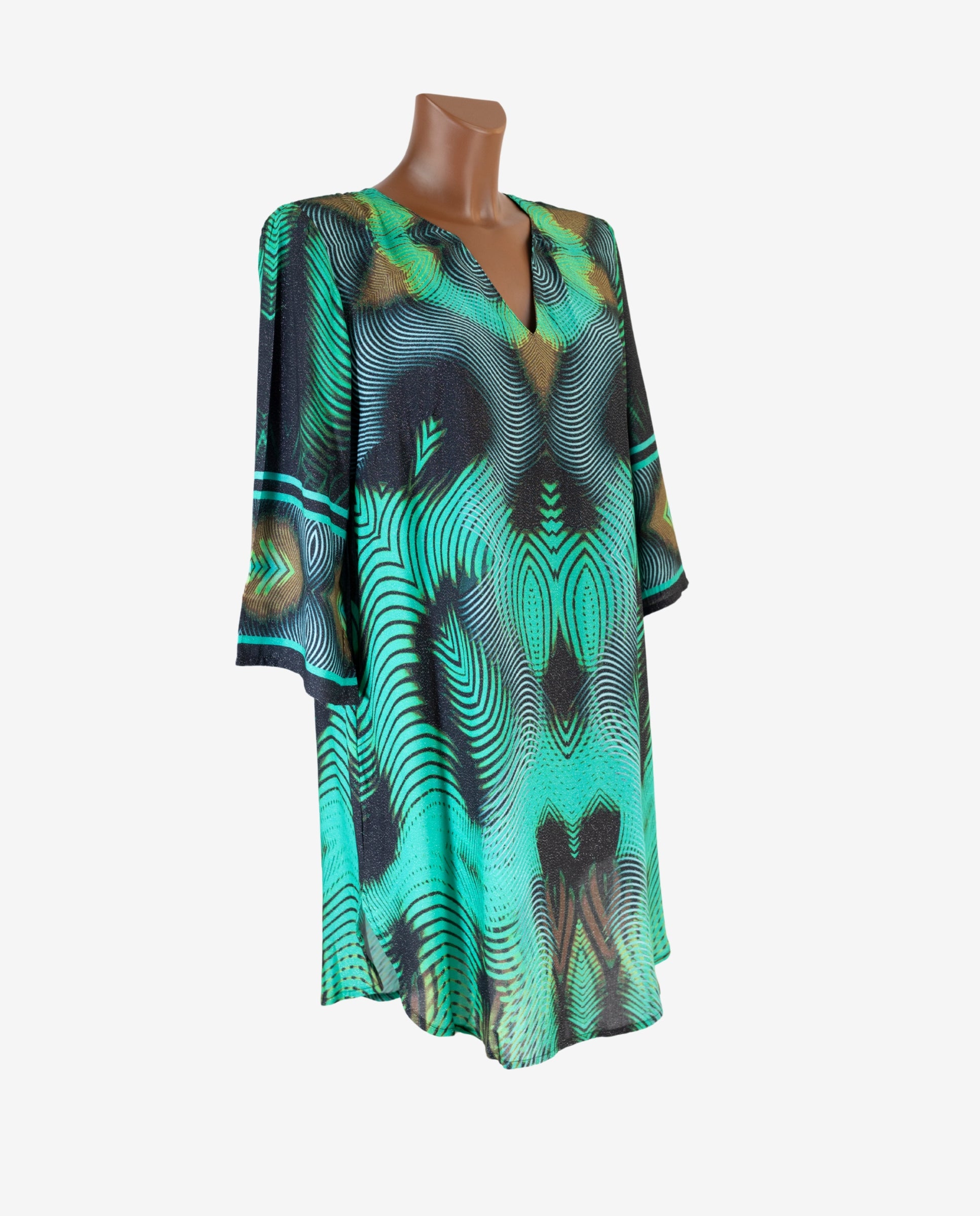 Il caftano verde menta di Salsedine è in viscosa pura — leggero, fresco, si infila in un secondo e trasforma l’uscita dal mare in un momento di stile. Il verde menta sull’abbronzatura è una delle combinazioni più riuscite dell’estate.